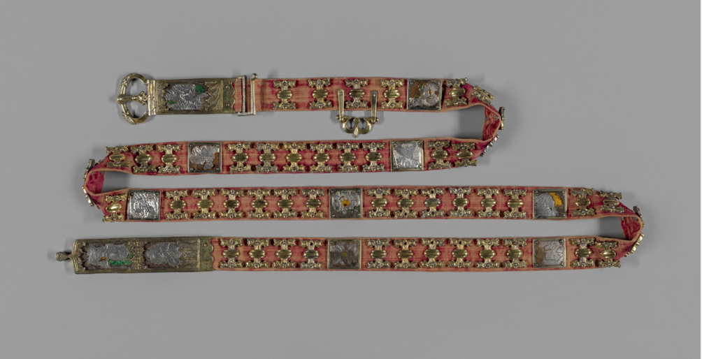 Coltelli, cintura 1. Liguria, Santuario, Montegrazie. icon 2. - Cintura, 1325-1375 circa (Nord Italia). In esposizione presso la Galleria delle Arti Applicate d’Europa, 238. icon Regesto: Gerolamo Calvo, draperius, in qualità di arbitro, condanna Margherita, già serva del fu Domenico de Pagana, da questi accusata di aver rubato degli oggetti. Estratto in latino: … gonas duas panni mischi, gonas duas fustanei, goneletam unam panni virmilii foderatam penne albe a domina. In una capsieta agoiharolium unum argenti. Par unum gladiolum argenti cum sua vagina deaurata. Anullos tres auri, videlicet sigillum unum auri, safirium unum, aliud de nomine non recordatur. Clavacorium unum argenti. Certas tahioretas telle, et uvete, etiam camixie et berete. Item goneletam unam a domina panni albi … Tipologia oggetto: … una gonna di panno grigio, due gonne di fustagno, una gonnella rossa imbottita. In un portagioie, un agoraio d’argento. Un paio di coltelli da cucina d’argento, con il loro fodero dorato. Tre anelli d’oro: uno con sigillo, uno con zaffiro, uno di cui non ricordano. Una cintura da donna d’argento. Alcune tovagliette di tela, giubbette, camicie e berrette. Una gonnella di panno bianco … Scheda a cura di Sandra Machiavelli e Leila Leoni Info Immagini 2. Link: https://www.artic.edu/artworks/241995/girdle-belt