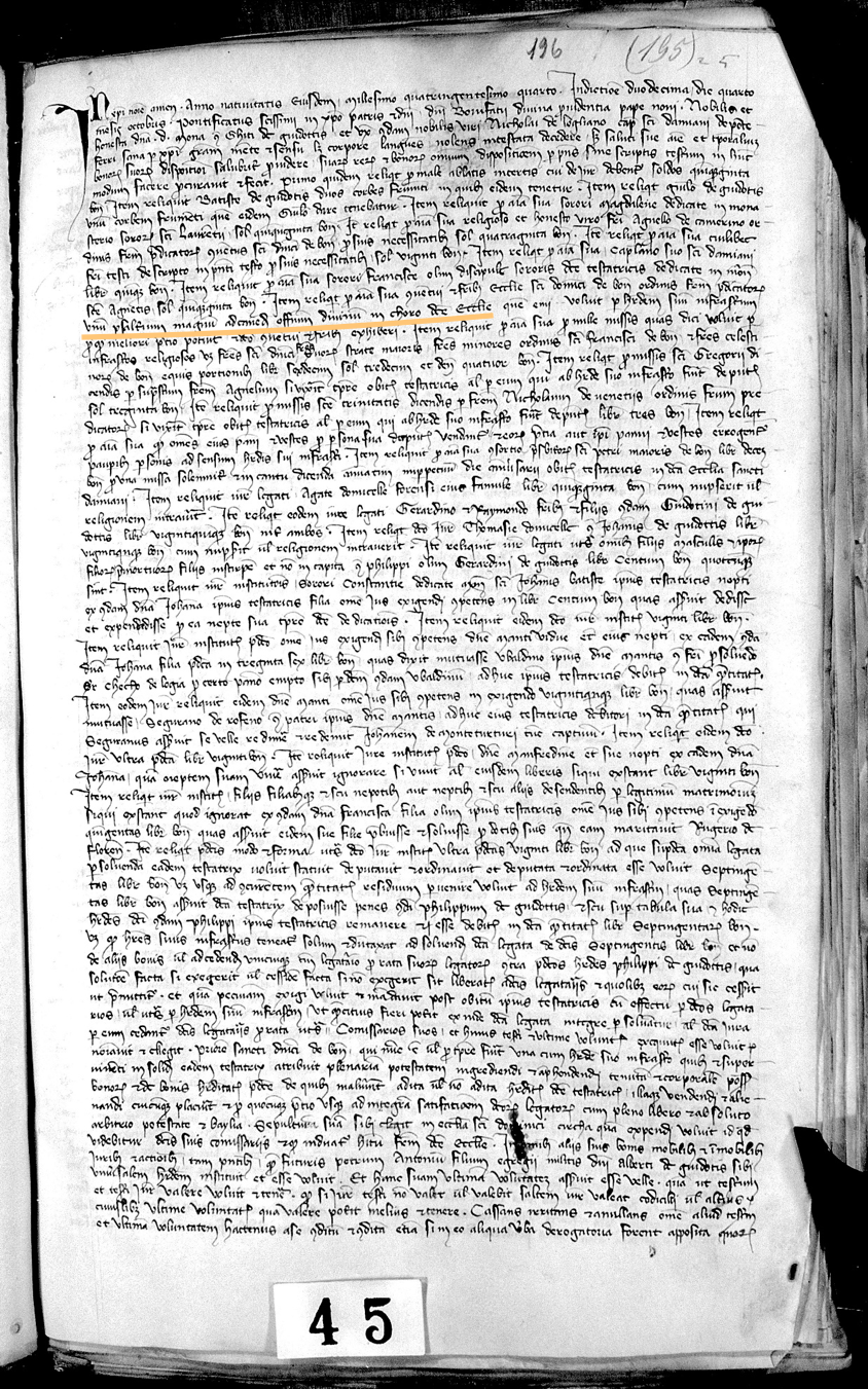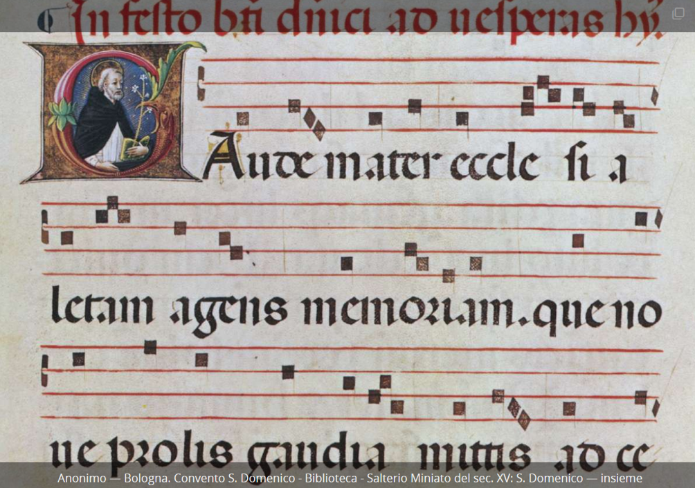 Salterio 1. Anonimo bolognese sec. XV, Bologna. Convento S. Domenico - Biblioteca - Salterio Miniato del sec. XV. Bologna, Fondazione Federico Zeri. I diritti d’autore risultano esauriti. icon Regesto: L’indicazione dell’acquisto di un salterio si colloca tra i legati pro anima disposti dalla testatrice, la quale manifesta un chiaro legame con l’Ordine dei frati Predicatori, tanto da disporre che la propria sepoltura avvenga non solo nella loro chiesa, ma anche indossando l’abito domenicano. Non sorprende quindi che gli otto testimoni presenti alla stesura del testamento siano tutti frati del convento di San Domenico. Dell’acquisto del salterio è incaricato un parente, Pietro Antonio figlio del miles Alberto de Guidottis, indicato come proprio erede. Estratto in latino: Item reliquit pro anima sua conventui et fratribus ecclesie Sancti Dominici de Bononia ordinis fratrum predicatorum unum psalterium magnum ad canendum officium divinum in choro dicte ecclesie quem emi voluit per heredem suum infrascriptum pro quam meliori pretio potuerit et dicto conventui et fratribus exhibiri Tipologia oggetto: Inoltre, Mona lascia per la sua anima al convento e ai frati della chiesa di San Domenico di Bologna dell’Ordine dei frati Predicatori un salterio solenne per cantare l’ufficio divino nel coro della chiesa di San Domenico di Bologna e vuole che sia comprato dal proprio erede sottoindicato al migliore prezzo che potrà e consegnato ai frati di quel convento L’indicazione dell’acquisto di un salterio si colloca tra i legati pro anima disposti dalla testatrice, la quale manifesta un chiaro legame con l’Ordine dei frati Predicatori, tanto da disporre che la propria sepoltura avvenga non solo nella loro chiesa, ma anche indossando l’abito domenicano. Non sorprende quindi che gli otto testimoni presenti alla stesura del testamento siano tutti frati del convento di San Domenico. Dell’acquisto del salterio è incaricato un parente, Pietro Antonio figlio del miles Alberto de Guidottis, indicato come proprio erede. Scheda a cura di Pietro Delcorno e Laura Pasquini Info immagini Link: https://catalogo.fondazionezeri.unibo.it/scheda/fotografia/176476/