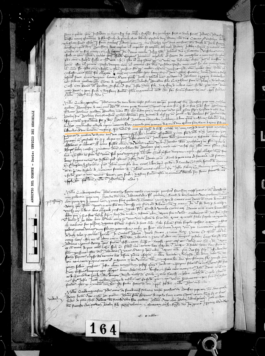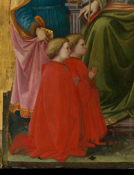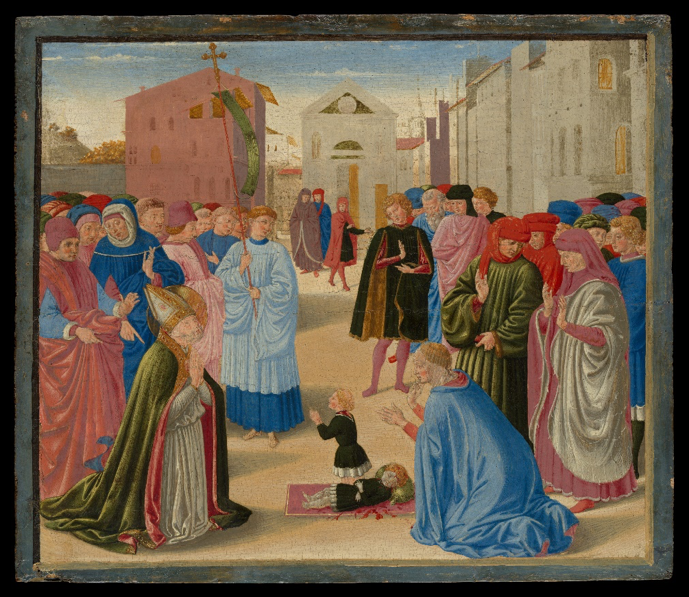 Tessuti preziosi e vesti 1. un mantello rosso – Filippo Lippi - San Lorenzo in trono con santi e donatori, 1440 – New York, Metropolitan Museum of Art icon 2. Particolare - un mantello rosso – Filippo Lippi - San Lorenzo in trono con santi e donatori, 1440 – New York, Metropolitan Museum of Art icon 3. gabbano di panno rosa foderato con una baldinella – Benozzo Gozzoli, San Zanobi resuscita un bambino morto, scomparto di predella, 1461 – 1462, New York, Metropolitan Museum of Art icon 4. Particolare - gabbano di panno rosa foderato con una baldinella – Benozzo Gozzoli, San Zanobi resuscita un bambino morto, scomparto di predella, 1461 – 1462, New York, Metropolitan Museum of Art icon Regesto: Melchione del fu Boninsegna de Auro, residente nella cappella di S. Maria di Porta Ravegnana, pone fine alla lite con Bartolomeo, detto anche Bertolino, del fu Bernardino nunzio del comune di Bologna, che aveva pignorato alcuni beni nella casa di Melchione nell’ottobre 1399, su mandato dell’allora capitano del popolo di Bologna. Estratto in latino: Fecit remissionem, quietationem, absolutionem et pactum gratuitum de aliquid pepetuo non petendo occaxione pignorationis de decem brachiis cum dimidio in duobus capiciis camucati, de uno mantello panni paunacii de grana, de uno gabano panni roxati de grana foderato baldinella, de uno linteamine magno Tipologia oggetto: fece fine, remissione, quietanza, assoluzione e stipulò un patto gratuito di non richiedere mai più alcunché riguardo al pignoramento di 10 bracci e mezzo in due scampoli di camucato, di un mantello rosso, di un gabbano di panno rosa foderato con una baldinella, di un lenzuolo grande Scheda a cura di Giulia Co Info immagini Link: https://www.metmuseum.org/art/collection/search/436897 —— Link: https://www.metmuseum.org/art/collection/search/436564