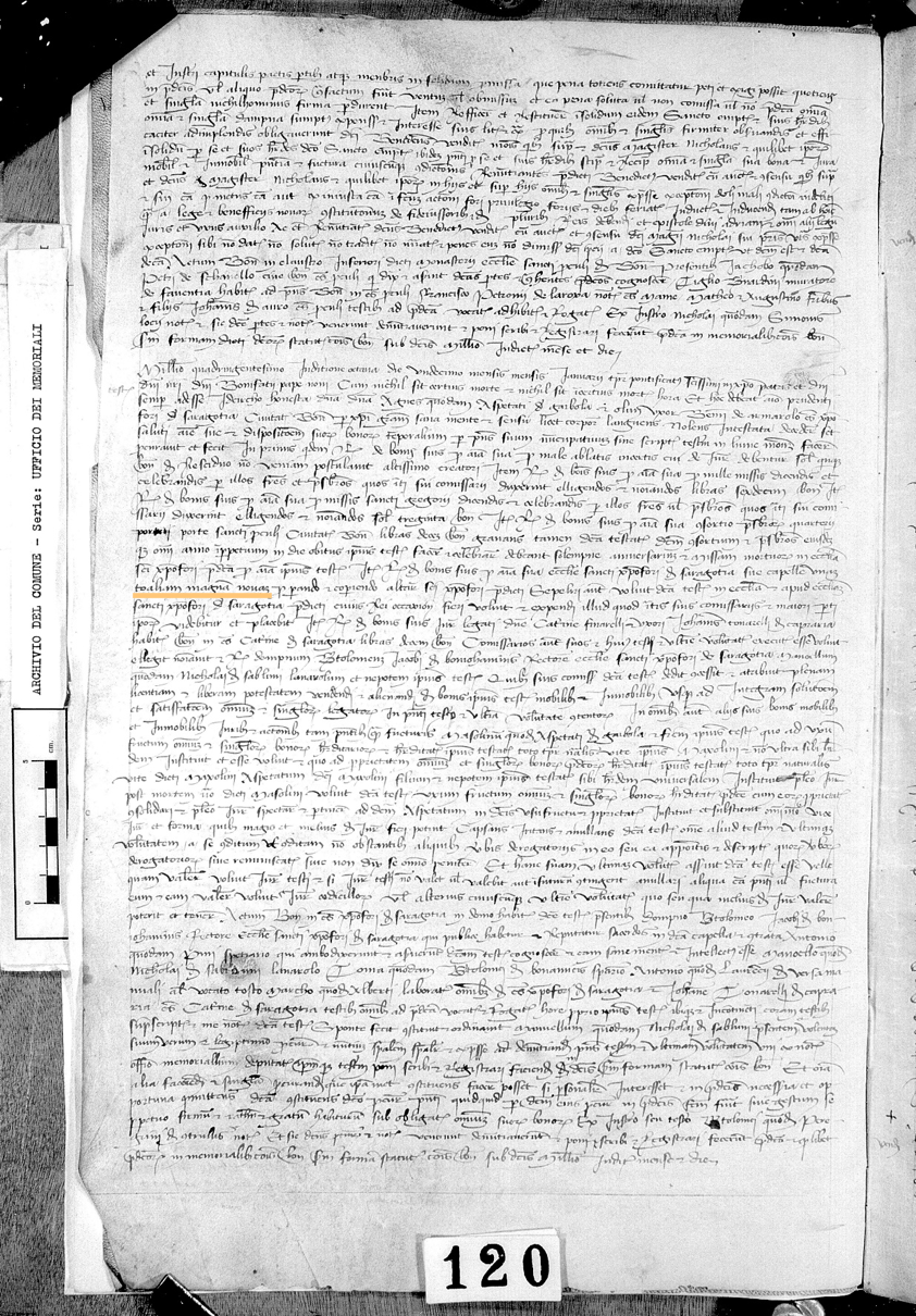 Tovaglia d’altare 1. Maestro della Leggenda di Santa Caterina (attivo secondo Quattrocento), Presentazione al tempio. Scomparto di polittico, tavola/pittura a tempera grassa. Firenze, Museo Nazionale del Bargello. icon 2.Tovaglia d’altare di produzione umbra, fine secolo XV. Museo della Pieve di Gorto – Cella di Ovaro (UD). icon 3. Tovaglia d'altare di lino damascato, Umbria XV secolo. Moimacco (UD), Bottenicco, Villa de Claricini Dornpacher, Archivio storico Fondazione de Claricini Dornpacher. icon 4. Tovaglia d'altare di seta, ambito toscano, XV secolo. Moimacco (UD), Bottenicco, Villa de Claricini Dornpacher, Archivio storico Fondazione de Claricini Dornpacher. icon 5. Tovaglia d'altare di lino ricamato, Umbria XV secolo. Moimacco (UD), Bottenicco, Villa de Claricini Dornpacher, Archivio storico Fondazione de Claricini Dornpacher. icon Regesto: Tra i lasciti per la celebrazione di messe pro anima sua, Agnese lascia al consorzio dei preti del quartiere di Porta San Procolo (la zona in cui abita) 10 lire di bolognini perché ogni anno, nell’anniversario della sua morte, celebrino una messa dei defunti per la sua anima nella chiesa San Cristoforo di Saragozza, cioè la propria parrocchia, dove chiede di essere seppellita e per la quale Agnese dispone di comprare una nuova tovaglia per l’altare. Ribadendo il legame di Agnese con la parrocchia in cui viveva, un oggetto specifico veniva posto a contatto con l’altare e con i riti liturgici che dovevano favorire l’approdo salvifico dell’anima di questa donna nell’aldilà e continuarne a fare risuonare il nome in uno spazio a lei familiare. Estratto in latino: Item reliquit de bonis suis pro anima sua ecclesie Sancti Christofori de Saragotia sue capelle unam tobaliam magnam novam pro parando et coperiendo altarem sancti Christofori predicti, sepeliri autem voluit dicta testatrix in ecclesia et apud ecclesia Sancti Christofori de Saragotia Tipologia oggetto: Inoltre, per la propria anima, lascia tramite i suoi beni alla chiesa di San Cristoforo di Saragozza, la propria parrocchia, una tovaglia grande e nuova per adornare e coprire l’altare della predetta chiesa di San Cristoforo; inoltre, la detta testatrice vuole essere sepolta nella chiesa o presso la chiesa di San Cristoforo di Saragozza. Tra i lasciti per la celebrazione di messe pro anima sua, Agnese lascia al consorzio dei preti del quartiere di Porta San Procolo (la zona in cui abita) 10 lire di bolognini perché ogni anno, nell’anniversario della sua morte, celebrino una messa dei defunti per la sua anima nella chiesa San Cristoforo di Saragozza, cioè la propria parrocchia, dove chiede di essere seppellita e per la quale Agnese dispone di comprare una nuova tovaglia per l’altare. Ribadendo il legame di Agnese con la parrocchia in cui viveva, un oggetto specifico veniva posto a contatto con l’altare e con i riti liturgici che dovevano favorire l’approdo salvifico dell’anima di questa donna nell’aldilà e continuarne a fare risuonare il nome in uno spazio a lei familiare. Scheda a cura di Pietro Delcorno e Laura Pasquini Info immagini Link: https://catalogo.beniculturali.it/detail/HistoricOrArtisticProperty/0900130743A-1 Link: https://patrimonioculturale.regione.fvg.it/opera/?s_id=520066 Link: https://patrimonioculturale.regione.fvg.it/opera/?s_id=518397 Link: https://patrimonioculturale.regione.fvg.it/opera/?s_id=518399 Link: https://patrimonioculturale.regione.fvg.it/opera/?s_id=518396