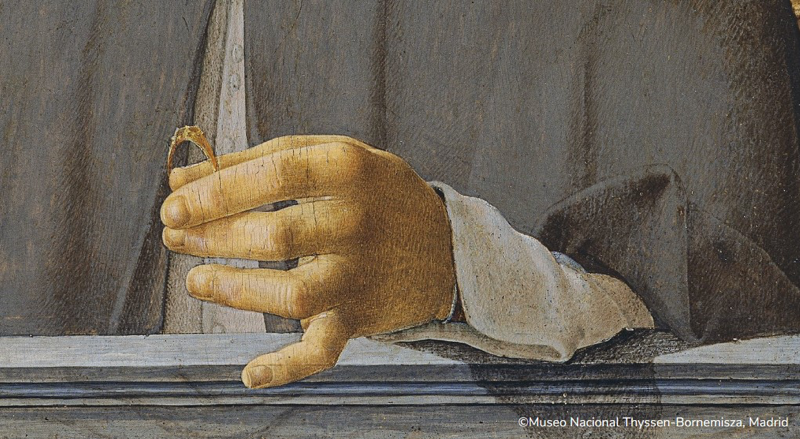 Tre anelli d’oro, uno rotondo con gemme 1. Particolare, Francesco del Cossa Ferrara, 1435, Bologna. icon Regesto: Giovanni de Valetari del fu Stefano, abitante di Calvari, nella podesteria di Bisagno, cede a Fabiano de Maiolo la riscossione di un credito che ha nei confronti di Iachinus de Crosa al fine di saldare un debito di 37 lire e 15 soldi per il quale è stato incarcerato presso la prigione della Malapaga di Genova. Estratto in latino: … anullos tres auri, unum rotundum cum suis gemmis … Tipologia oggetto: tre anelli d’oro, uno rotondo con gemme Scheda a cura di Sandra Machiavelli e Leila Leoni