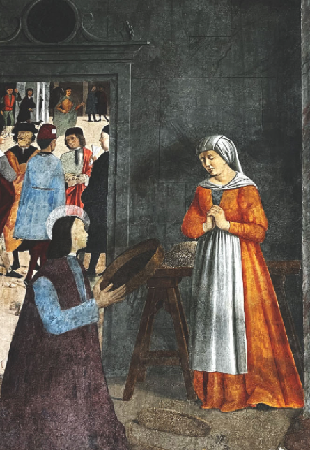 Vestito e scrigno 1. Box | Italian | The Metropolitan Museum of Art icon 2. Gonnella: foto propria. Affresco rinascimentale, che decora le pareti del chiostro dell’ex convento di San Severino e Sossio oggi sede dell’Archivio di Stato di Napoli, raffigurante le storie di San Benedetto. Di Antonio Solario detto lo Zingaro. icon Regesto: Bartolomeo Mascambrone e Paolo Francaterra procuratori dell’ospedale e chiesa dell’Annunziata di Benevento concedono ad Antonia, esposta dell’Annunziata, futura sposa di Andrea Farese de Prata, figlio di Ioacopo Farese, la dote composta da vari oggetti, tra cui un vestito e uno scrigno. Estratto in volgare: uno paro de maniche; una gonella; unaltro paro de maniche; una coberta et uno piomazo; uno paro de lenzola; una coberta usata; uno mesale; guardanappi; uno cossino; una toaglya de carpia; unaltra toaglya de carpia; una concha et una concolina; una cathena da foco et una fressora; uno caldariujello; denari contanti; uno scrignyno; uno crino co argento in aurato. Tipologia oggetto: un paio di maniche; un vestito; un altro paio di maniche; una coperta e un piumone\parte interna del letto; un paio di lenzuola; una coperta usata; una tovaglia per la mensa; tovaglioli; un cuscino; un’altra tovaglia in peluria di lana (carpia); una conca e una conca più piccola; una catena da fuoco e una padella; un piccolo calderone; soldi in contanti; uno scrigno; crine con decorazioni in argento. Scheda a cura di Miriam Palomba Info immagini Link: Box | Italian | The Metropolitan Museum of Art